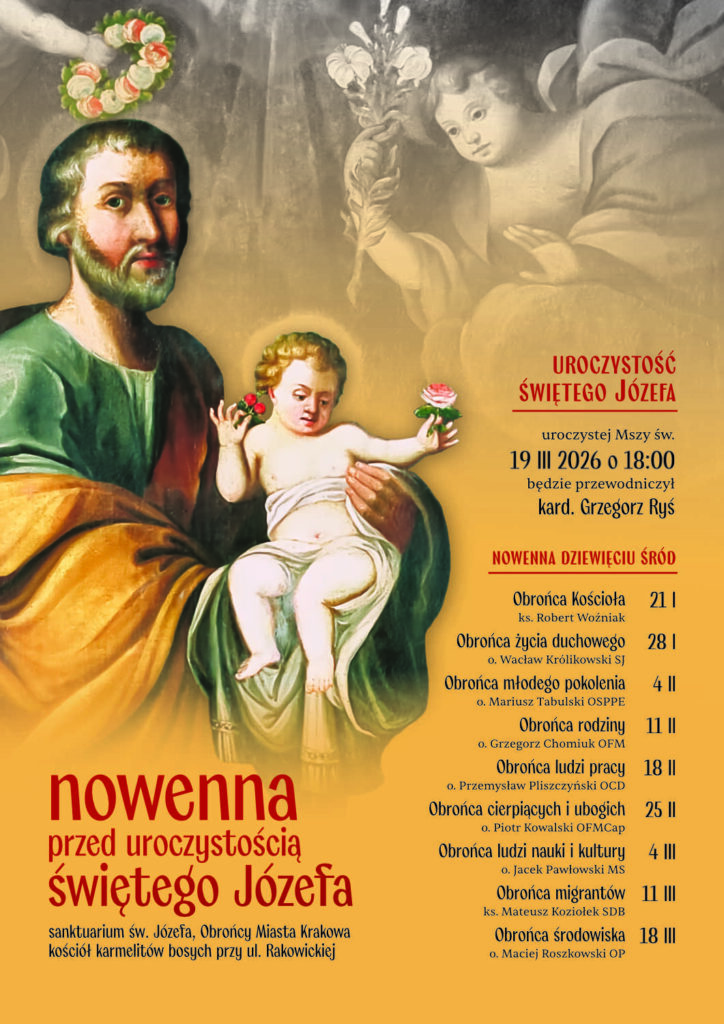 Zapraszamy do udziału w dziewięciośrodowej nowennie przed uroczystością św. Józefa. W kolejnych tygodniach będą nam towarzyszyć krakowskie seminaria. Tematem tegorocznej nowenny jest św. Józef jako obrońca w różnych potrzebach.